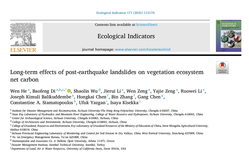 3. He W, Di B, Wu S, et al. Long-term effects of post-earthquake landslides on vegetation ecosystem net carbon[J]. Ecological Indicators, 2025, 171: 113170. https://doi.org/10.1016/j.ecolind.2025.113170.