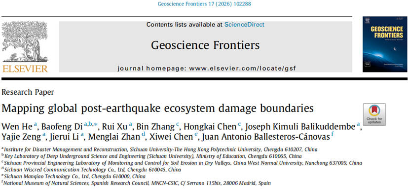 1. He W, Di B, Xu R, et al. Mapping global post-earthquake ecosystem damage boundaries[J]. Geoscience Frontiers, 2026: 102288. https://doi.org/10.1016/j.gsf.2026.102288.