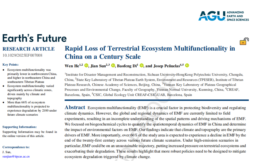 2. He W, Sun J, Di B, et al. Rapid loss of terrestrial ecosystem multifunctionality in China on a century scale[J]. Earth's Future, 2026, 14(2): e2025EF007008. https://doi.org/10.1029/2025EF007008.