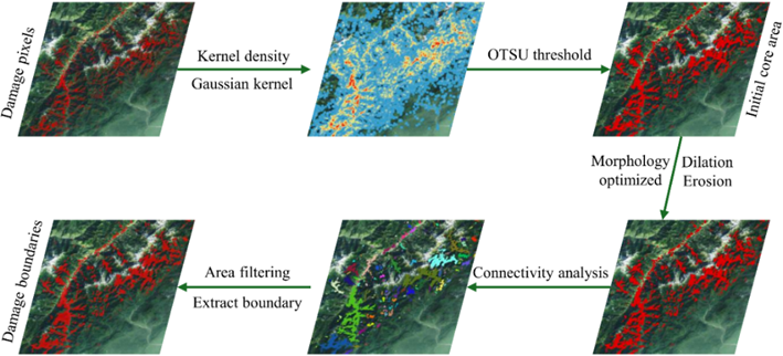 为破解这一难题,研究团队依托十余年在山地灾害与生态效应领域的持续积累,创新性地融合卫星遥感大样本、长时序数据与智能识别算法,提出了一套全新的解决方案。研究利用谷歌地球引擎云平台,系统分析了近20年全球发生的284次6.0级以上的浅源地震,采用连续变化检测等算法对海量陆地卫星影像进行深度挖掘,精准识别震后突变像元,进而结合核密度估计、自适应阈值分割与形态学运算,绘制出了全球震后生态系统受损边界。