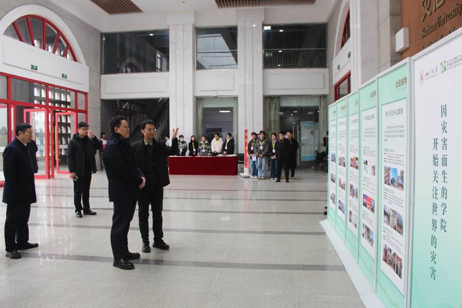 在学院专题展区,第宝锋向杨兴平介绍了学院发展历程,重点汇报了学院“登高识灾、古灾今鉴、灾难健康、韧性减灾”四大科研核心战略方向,以及学院近年来在国内外重大自然灾害应急支援、灾后重建建言献策、公共防灾减灾科普教育等方面的社会服务成效。作为全球首个集综合防灾减灾与恢复重建管理领域科学研究、人才培养和社会服务为一体的新型学院,灾后重建与管理学院始终坚持服务国家防灾减灾事业,在历次重大自然灾害中积极响应、主动作为。
