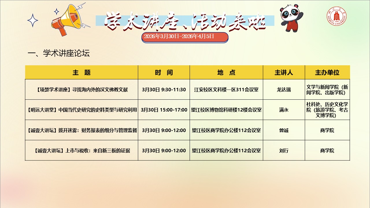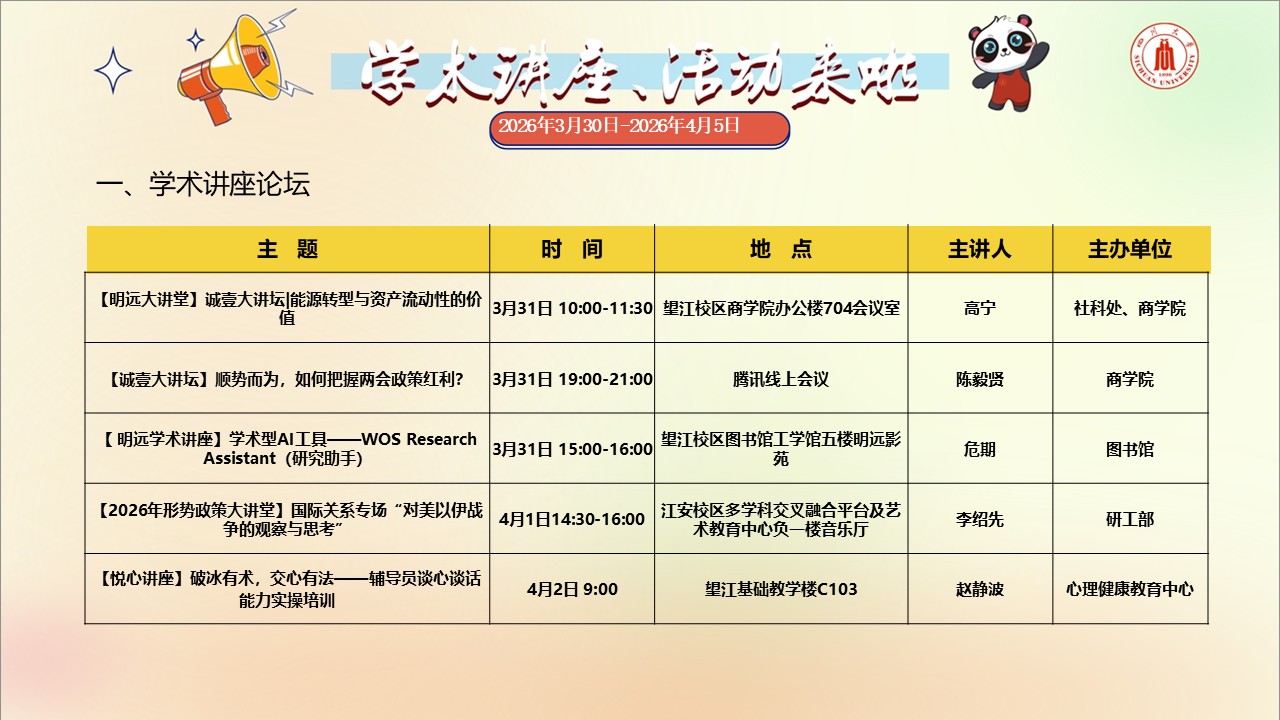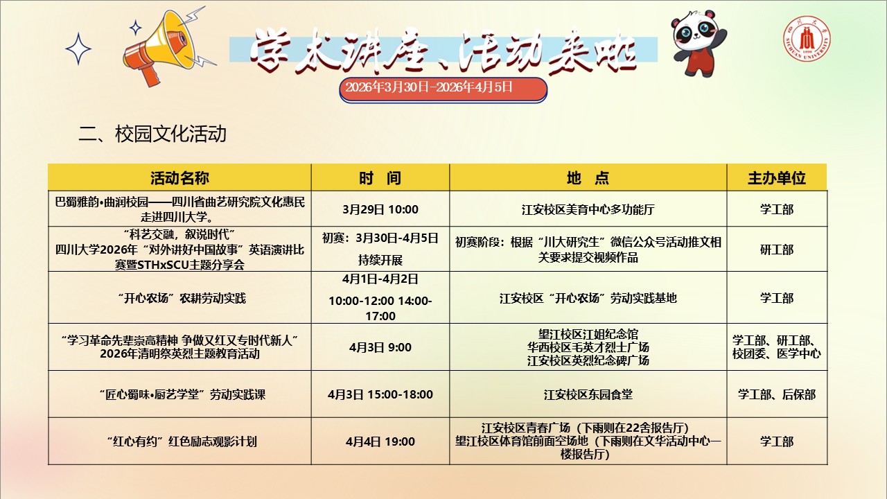 四川大学2026年3月30日-4月5日学术讲座与校园文化活动预告