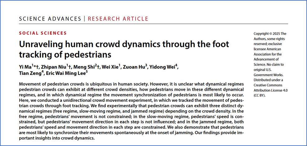 Recently, Associate Researcher Ma Yi from IDMR published an article titled "Unraveling human crowd dynamics through the foot tracking of pedestrians” in the Science Advances (AAAS) Journal . By tracking pedestrians' gaits, the study delves into how people adjust their movement speed, direction, and gait in response to perceived environmental information as they move through a crowd. The study has laid an important theoretical foundation in research for crowd evacuation prediction, humanoid robot gait design, and autonomous vehicle pedestrian movement prediction.