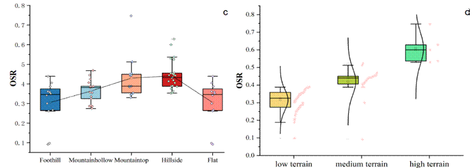 图3 (a)不同海拔条件下寺庙OSR的对比 (b)不同坡度下寺庙OSR的对比 (c)不同类型寺庙OSR的对比 (d)不同地形位下寺庙OSR的对比
