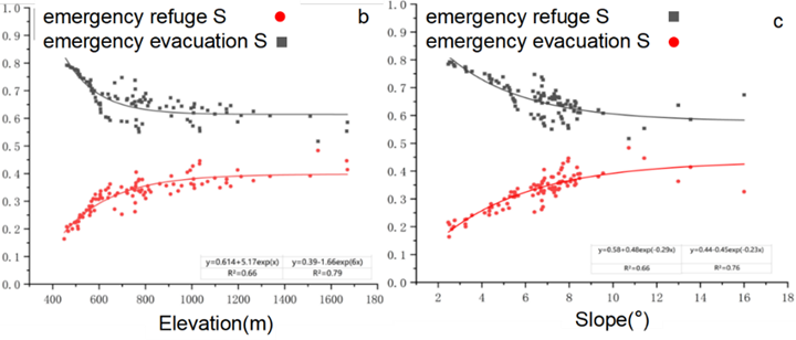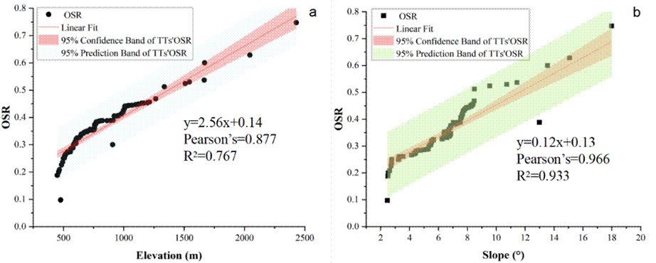 寺庙防灾空间在不同海拔高度的分布情况,是衡量其抗灾能力的关键指标。寺庙整体防灾空间比例为36%,开放空间比例(OSR)随海拔升高呈明显线性上升趋势(图3a)。同时,随着坡度增大,寺庙OSR逐步提升(图3b)。平原、山坡、山坳、山顶、丘陵型寺庙的OSR分别为29%、44%、36%、43%、31%(图3c)。高地形位置寺庙的OSR是低地形位置的四倍,表明在选址时优先选择高地形位置的寺庙,能显著增加开放空间以缓解救灾压力(图3d)。