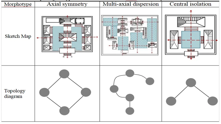 寺庙建筑群在空间布局、功能用途及建造时期等外部条件影响下,形成了复杂的空间机制。这些空间可分为自然绿地、园林空间、露天朝拜区和廊道空间,每种类型都兼具避难所与疏散通道的功能。根据寺庙内部各类空间要素的数量、位置、形态、面积及类型,研究归纳出三种典型寺庙布局形态:轴对称式、中央孤立式和多轴分散式(图4)。