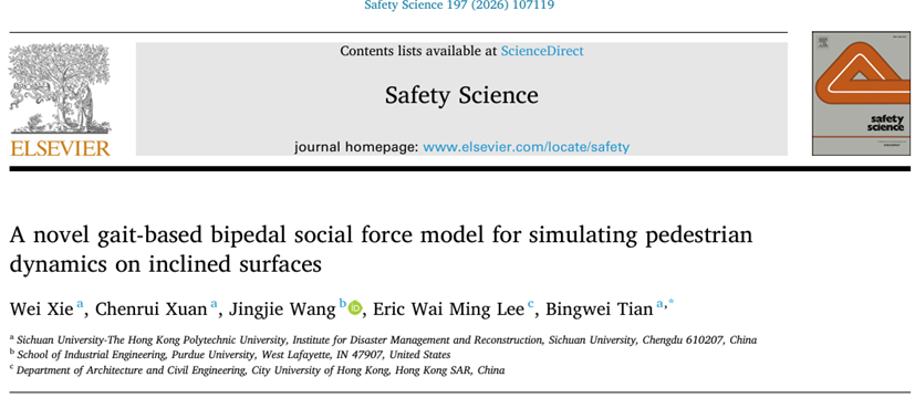 谢玮副研究员(第一作者)、田兵伟副教授(通讯作者)发表于《Safety Science》的研究,首次提出了融合生物力学特征的双足步态社会力模型,通过将行人运动分解为质心和步态运动,实现了斜坡约束下的人群动力学精细化模拟,系统揭示了坡度对行人步长、步速等关键步态参数的影响规律。我国多山地和丘陵的地理条件造就了不同的斜坡地形,研究成果对于预防类似韩国梨泰院斜坡人群踩踏事故、提升复杂山地环境下的应急疏散效率具有重要意义。